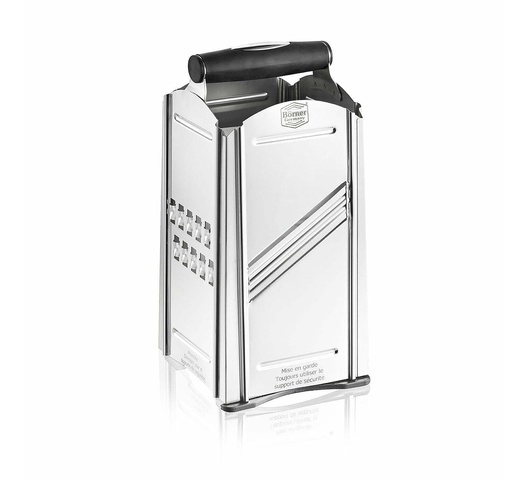 The Börner Combi Chef is an essential 4-in-1 kitchen tool designed to prepare healthy, quick meals from fruits and vegetables. Its two-sided stainless steel blades offer four cutting options, including slices, julienne, and perfect rasps for rösti or cheese, allowing you to let your creativity run wild. This practical grater features a rubber grip and a collection container, ensuring easy use and a clean kitchen.