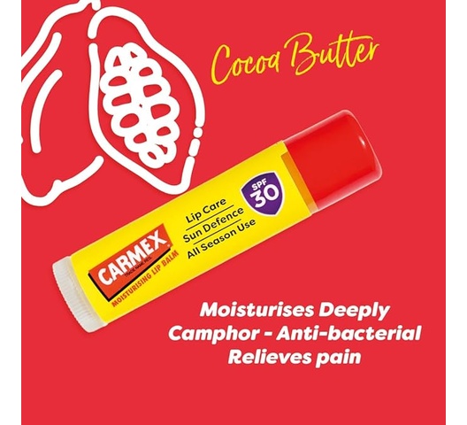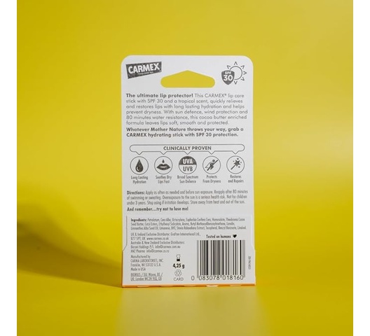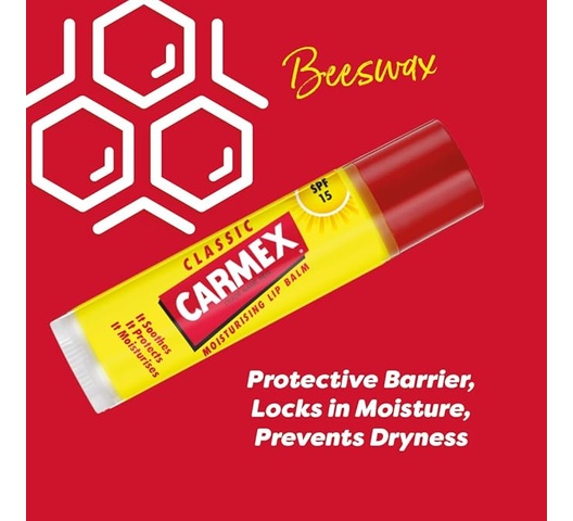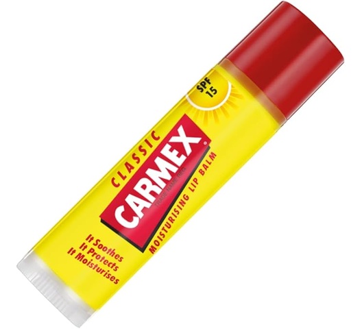 The Carmex Stick (4.25 g) is the classic Carmex formula in a twist-up stick format. It a medicated relief, in a hands-free, portable format that’s easy to apply on the go, protecting lips from dryness while being convenient for frequent use.