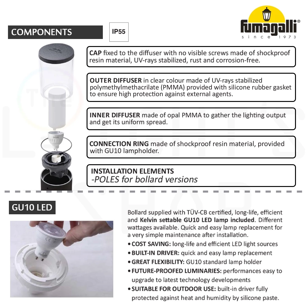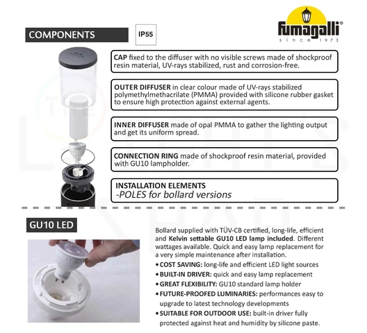 | Care & Maintenance | Made from shockproof resin material, UV-rays stabilized, rust and corrosion-free. Designed to resist discolouration or fading, requiring no painting or specific maintenance. Features quick and easy lamp replacement due to the standard GU10 holder. |
