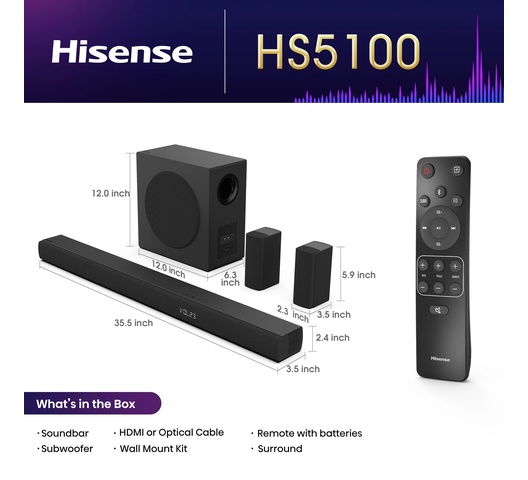 | What's included | 1 x Hisense Hisense HS5100 5.1CH Soundbar - 540W, 1 x User Manual, 1 x Warranty Card |