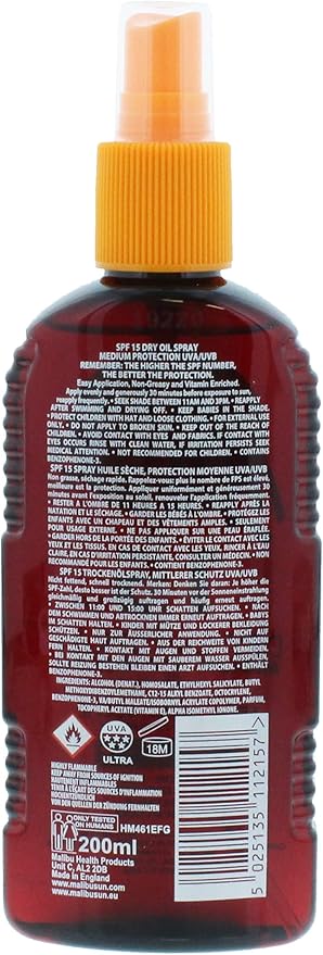 Malibu SPF15 & Insect Spray is a multipurpose spray that protects against UVA/UVB sun damage and insect bites. Its lightweight, non-greasy formula is water resistant, photostable, and designed to be gentle on skin while offering dual defense outdoors.