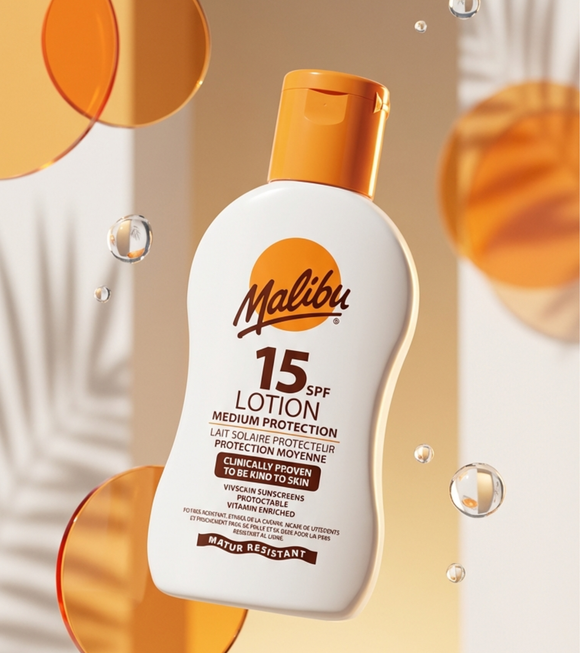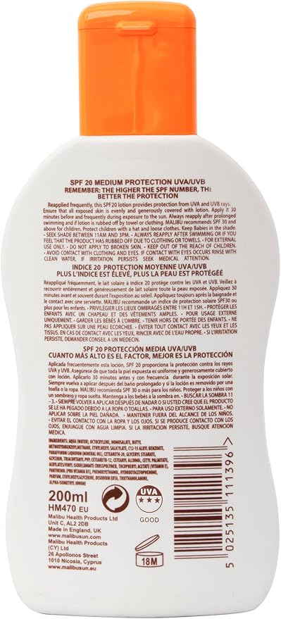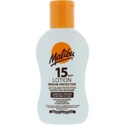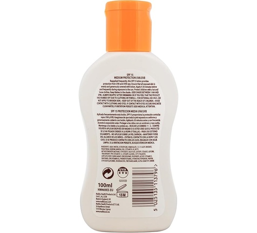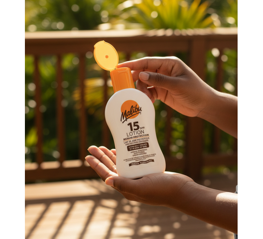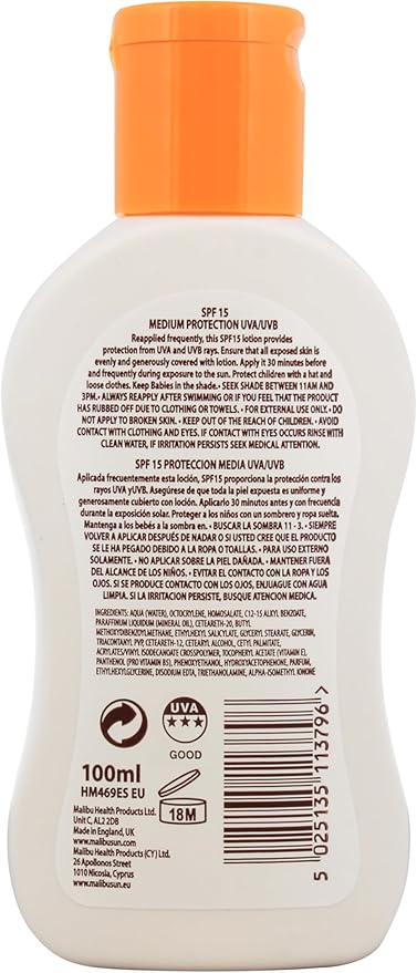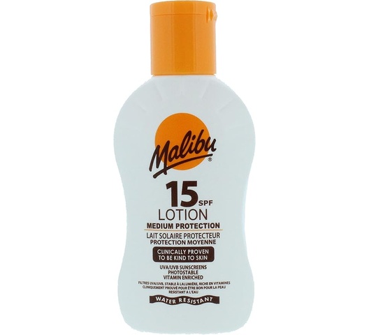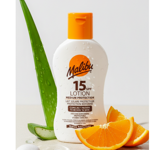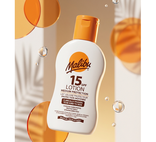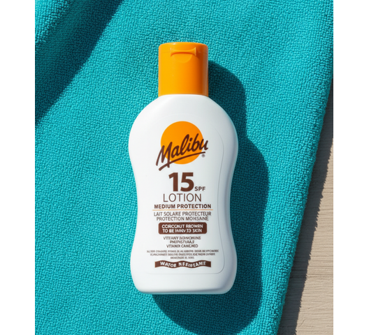 Malibu SPF15 Lotion Protection is a medium-SPF sunscreen lotion providing broad UVA/UVB protection. Made in England and enriched with vitamins, it’s photostable, water-resistant, and designed to be kind to skin for everyday sun exposure.